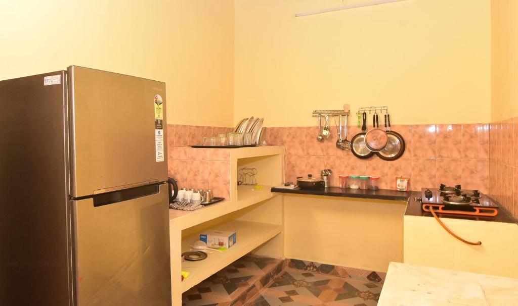 The villa has a beautiful facade however it's old and very damp. The ground floor one room has an attached tiny toilet. The room also has a lot of mosquitos and smells weird. The second room is small with no windows, the AC doesn't work that well. The TV is small, old and has no channels subscribed. It has a beautiful skylight next to the staircase which is good. There are extra toilets built under the staircase however they are not fully closed. The house does have two fridges, microwave, stove and RO water.The top terrace is a pretty place to spend the evening however it's not glass covered and the water from the top floor AC flows directly onto the terrace. The top floor room is huge and is the best room of all three available rooms.One good thing about the house was its proximity to all the cafes and beaches.